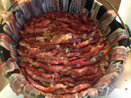 Am nächsten Tag legt man den Dutch Oven mit Bacon aus. Dabei legt man nicht nur den Boden und den Rand aus, sondern lässt den Bacon noch 3 bis 5 cm über den Topf hinaus hängen. Später, wenn das Fleisch im Topf ist, wird der Bacon dann oben drüber geklappt. Beim ft9 kommt man mit ca. 450 Gramm Bacon ganz gut hin.