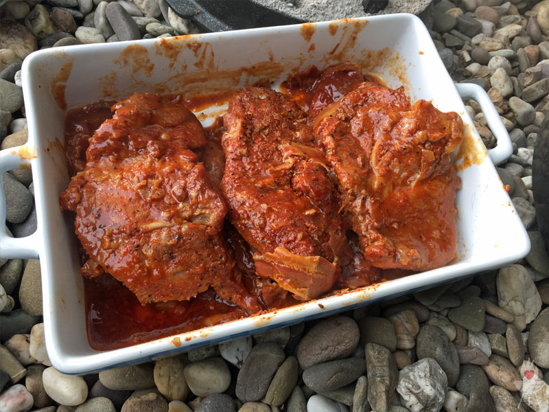 Das Fleisch wird über Nacht im Kühlschrank aufbewahrt, damit das Gewürz schön einzieht.